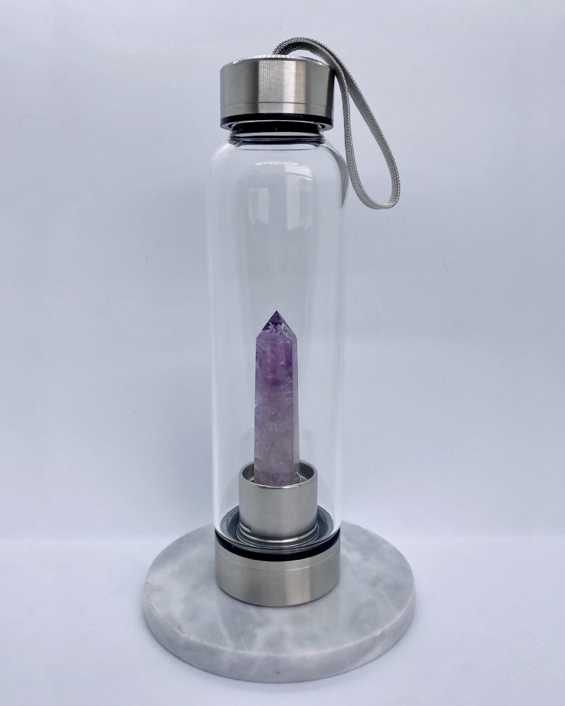 A ametista, que fica em contato constante com o líquido no interior da garrafa, é conhecida por suas propriedades de proteção energética, equilíbrio emocional e fortalecimento da espiritualidade. Sua vibração deixa o líquido energeticamente carregado com as propriedades do mineral, capaz de promover calma, clareza mental e conexão interior.