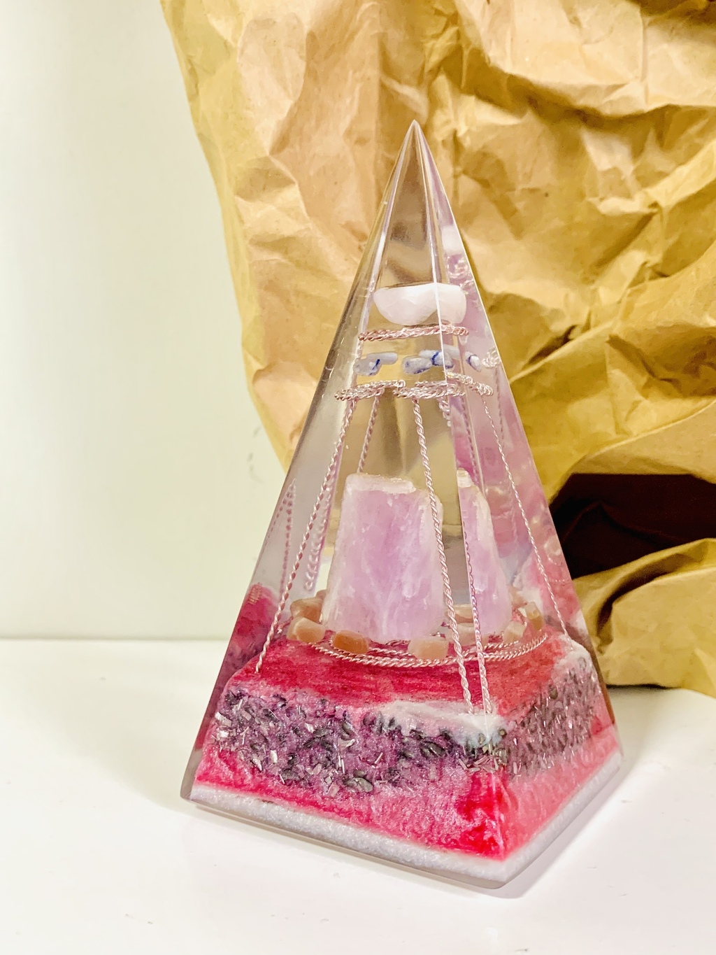 Esta orgonite em formato de pirâmide combina proteção, serenidade emocional e estímulo ao amor. No topo, o Quartzo Rosa suaviza tensões, fortalece amor-próprio e promove acolhimento, criando uma base emocional estável. O espiral de cobre garante que essa energia se espalhe por toda a peça, conectando e amplificando os efeitos dos demais cristais.