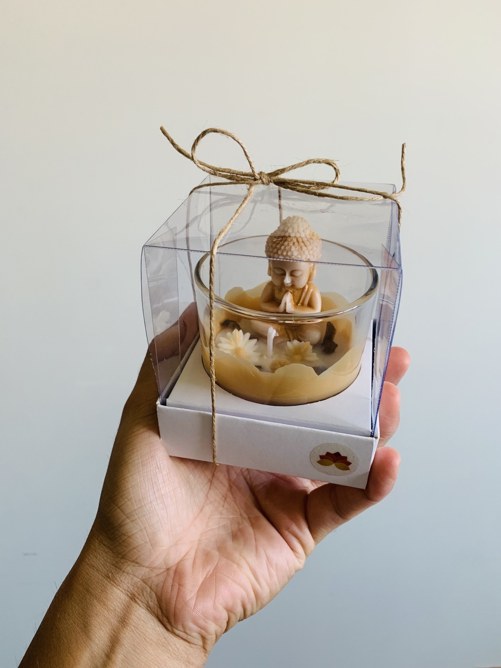 A coleção Aura traz velas únicas, feitas com cera de coco e um aroma fresco de cascas e folhas. Cada vela acompanha mini cristais, flores e um pequeno Buda também feito de cera de coco, formando um jardim de boas energias.